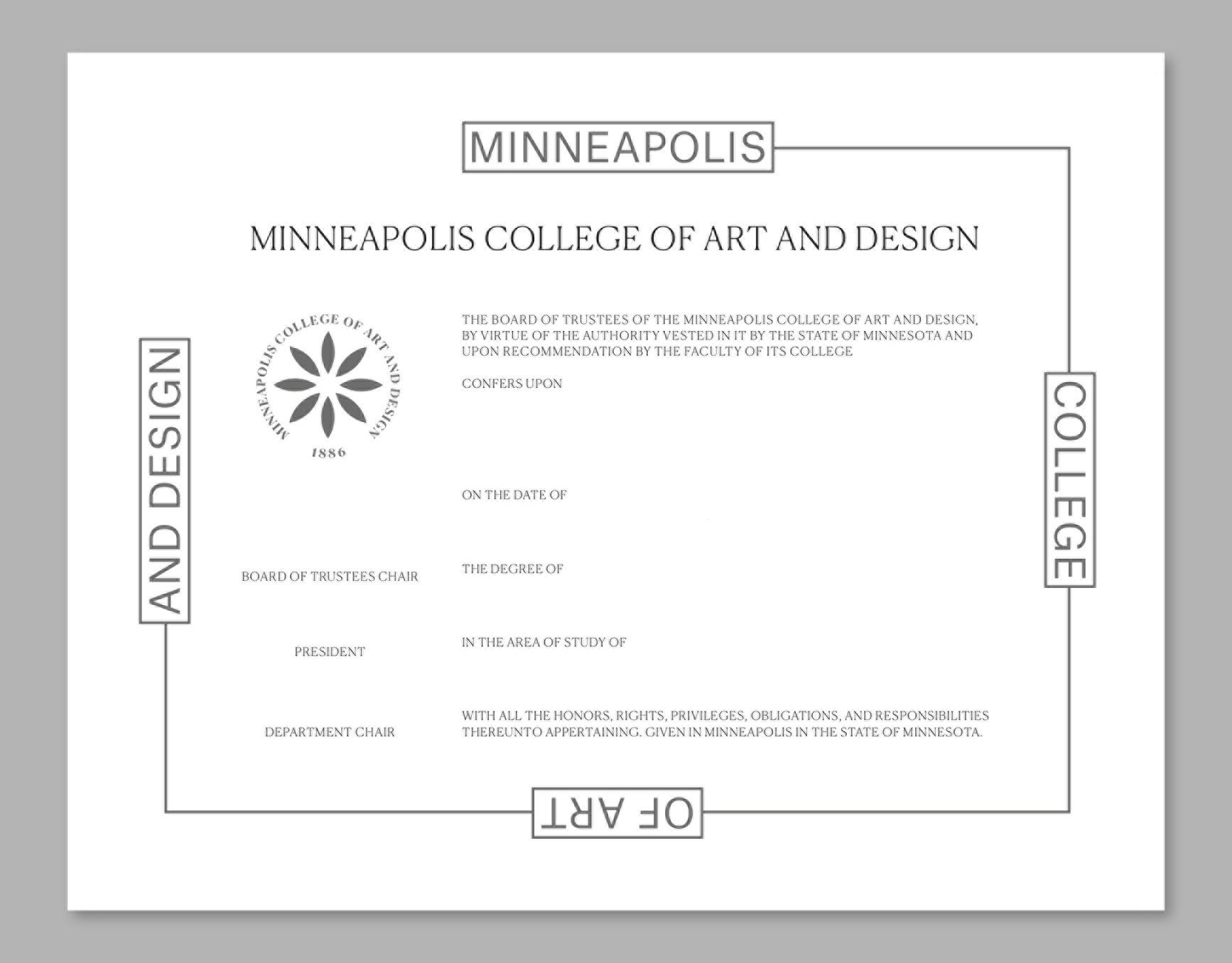 The goal of this project was to redesign the MCAD diplomas to better reflect the new MCAD brand and to create a more elevated and meaningful presentation for recent graduates. The diplomas previously awarded did not accurately represent the identity and skills of the students. I knew I had to create a new diploma that captured what I saw in my fellow graduates. I understood that the new design not only needed to look professional, but also had to embody the essence of what MCAD has represented across generations. I believe this design successfully accomplished that goal. I'm proud to say that this diploma is currently in use, and I hope graduates feel proud to display it, both on their walls and to future employers.