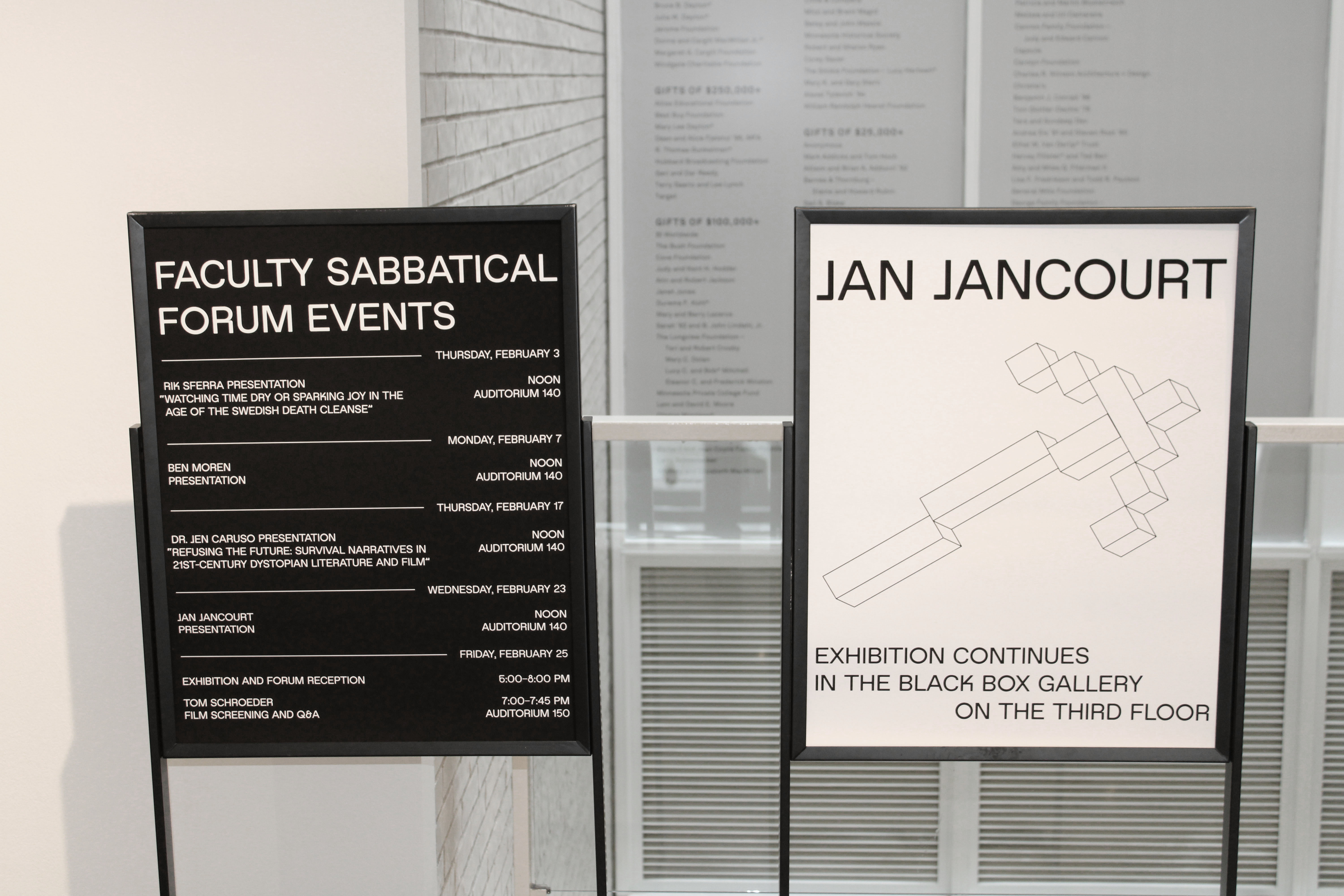 For the event support, I designed a title wall vinyl and informational signage that was strategically placed throughout the exhibition space. The title wall vinyl included the exhibition title, a list of the participating faculty members, and how long the exhibition was up for. The informational signage was designed to provide context and background information about each artist’s talk they would give to the MCAd community about their work on display.